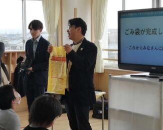 【バイオマスレジンマーケティング】 新潟市指定ごみ袋の完成を受けて、田植えをしてくれた新潟市立潟東小学校5年生の児童に、完成したごみ袋の披露と環境学習を行いました。