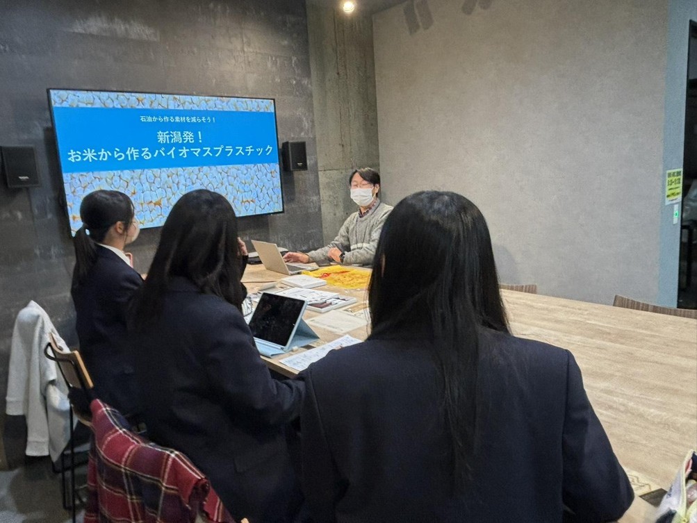 プラスチックに依存するファストファッションについて、新潟ならではの廃棄米を使い、国際問題を解決できないかを考え、その素材を「お米から作るバイオマスプラスチック」にしたらどうかという提案でした。チーム4人が、バイオマスレジンマーケティングに訪問頂き、意見交換を実施しました。