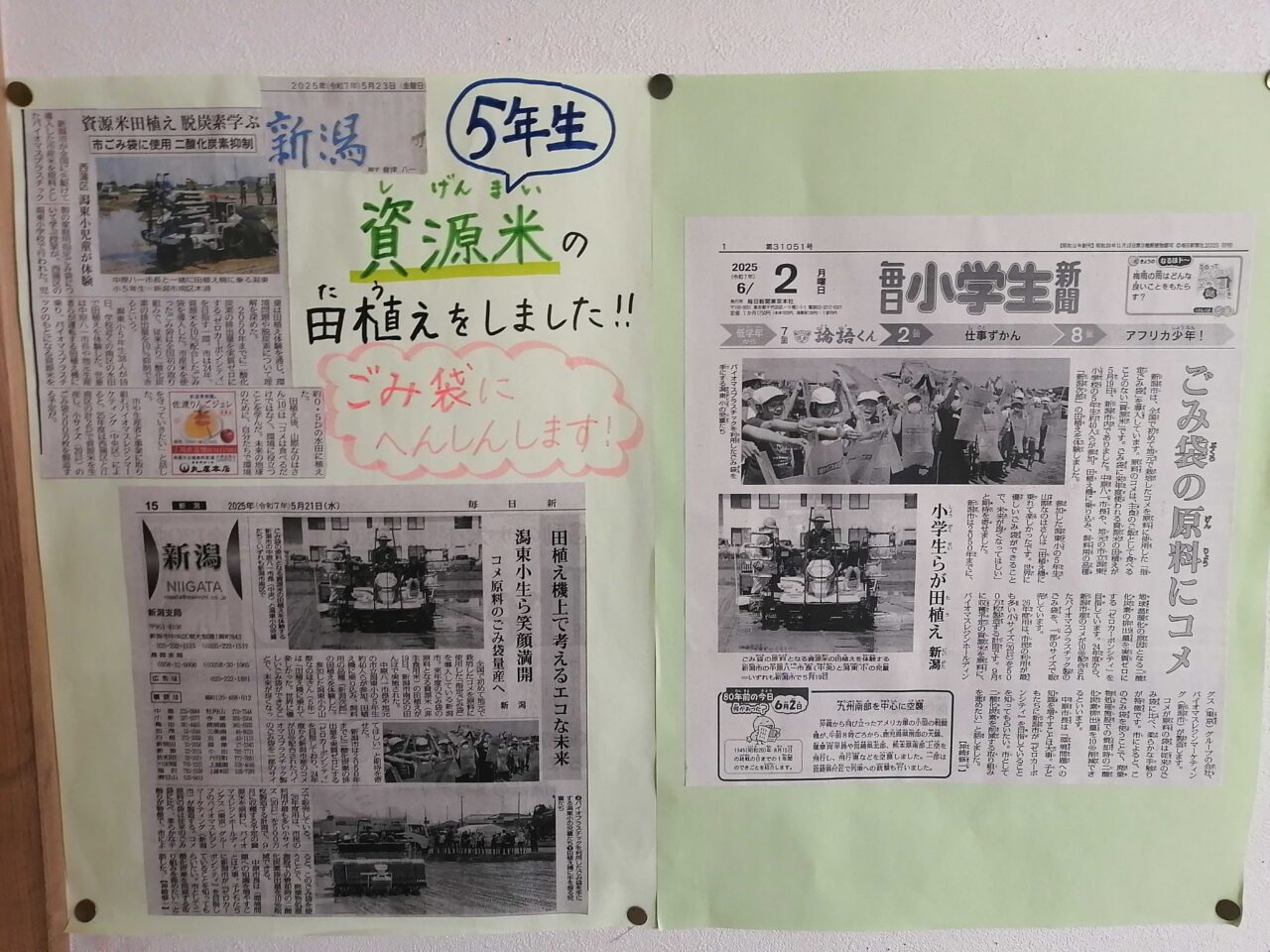 潟東小学校の校舎の壁には、資源米の田植えをした時に報道された新聞記事のスクラップが貼られていて、関心を高さを感じました。